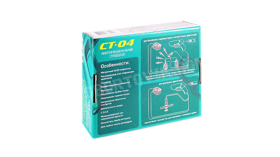 Автомобильный стробоскоп СТ-04 предназначен для измерения и правильной установки угла опережения зажигания, диагностики неисправных узлов системы зажигания на карбюраторных и инжекторных двигателях. А так же для проверки правильной установки угла опережения впрыска топлива на дизельных двигателях.