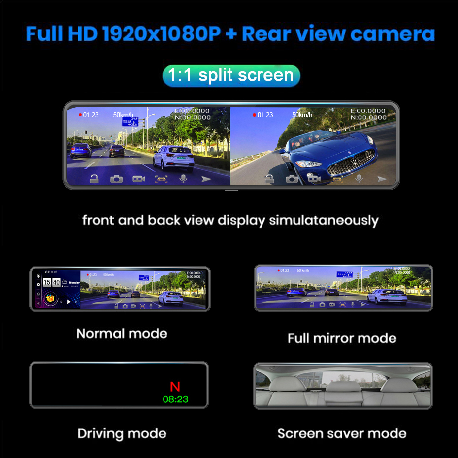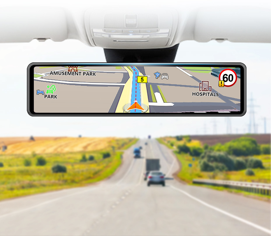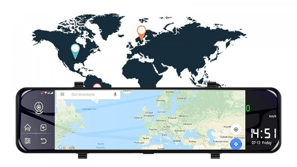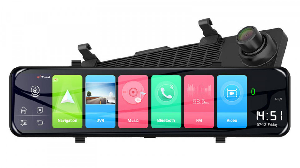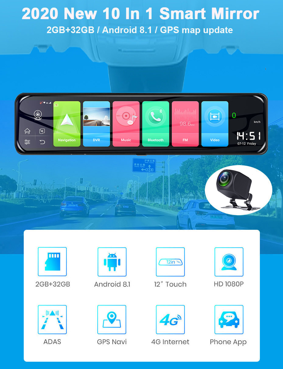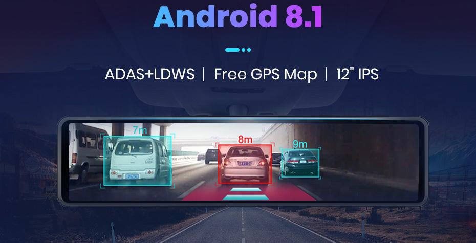 Зеркало (накладка) со встроенным видеорегистратором на ОС Android 8.1, дисплей IPS LCD 12″ (11.88"), поддержка 4G/3G, Wi- Fi, Bluetooth, GPS навигатор с картами Украины, система ADAS (контроль полосы движения, расстояние до впереди идущего автомобиля).