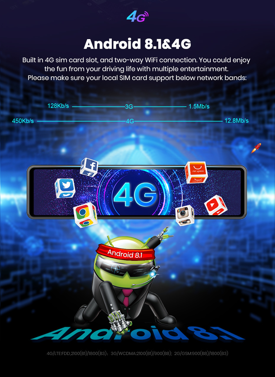 Высокопроизводительный четырех ядерный процессор Spreadtrum SL8541E 1,5 ГГц с операционной системой Android 8.1. делает автомобильный видеорегистратор более быстрым. Так же Вы можете скачать и установить любое приложение из Google Play Store.