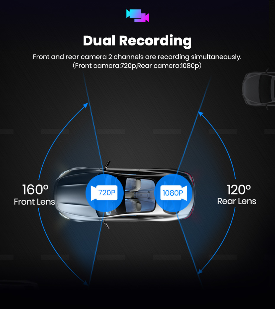 Это устройство поставляется с двумя широкоугольными камерами. Две камеры могут записывать одновременно, автоматически захватывая каждый мимолетный момент.